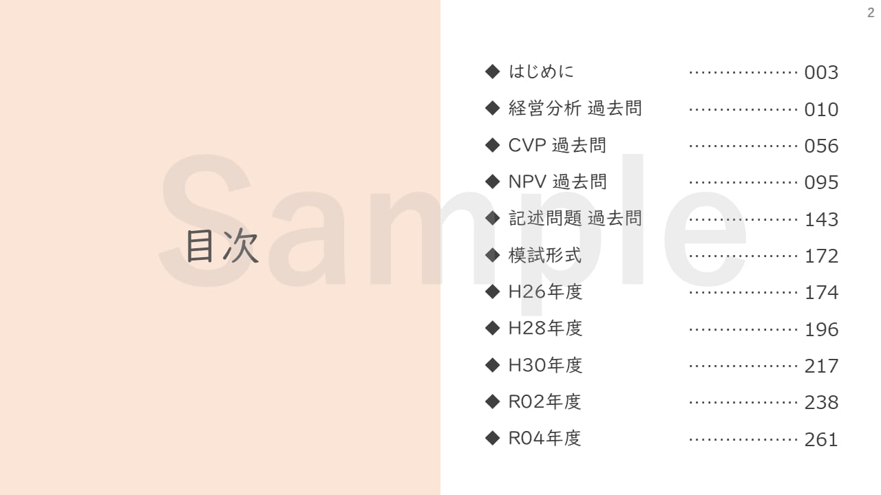 過去問10年分について、世の中にあるその答えや解説の多くを掘り下げ、最も納得のいく模範解答としてこの一冊に全て集約しました。この過去問マスターガイドで事例Ⅳの本試験対策力を身につけ、高得点をゲットしましょう!